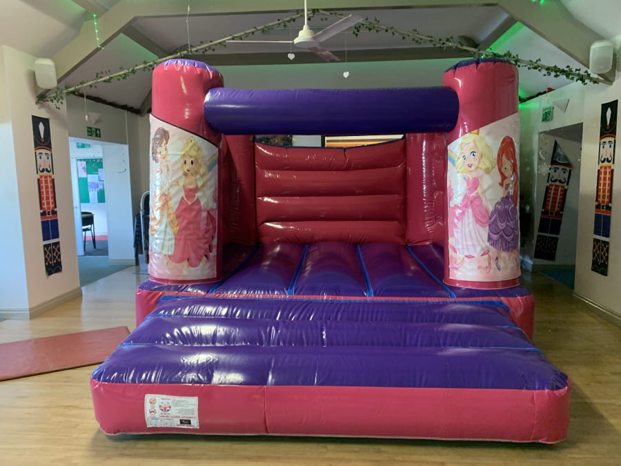This indoor princess bouncy castle in its shiny gloss pink and purple material is great for indoor venues with low ceilings